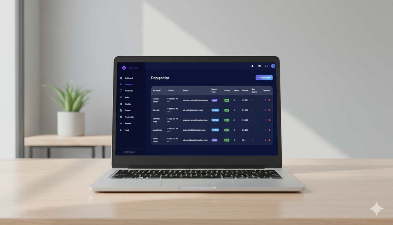 Terapinot, psikoterapistlerin danışanlarını profesyonel bir şekilde yönetmelerini sağlayan gelişmiş bir sistem sunar. Her danışan için detaylı profil oluşturabilir, iletişim bilgilerini kaydedebilir ve seans geçmişlerini takip edebilirsiniz. Sistem, danışanların aktif/pasif durumlarını izleyerek hangi danışanlarınızla düzenli çalıştığınızı kolayca görebilmenizi sağlar.