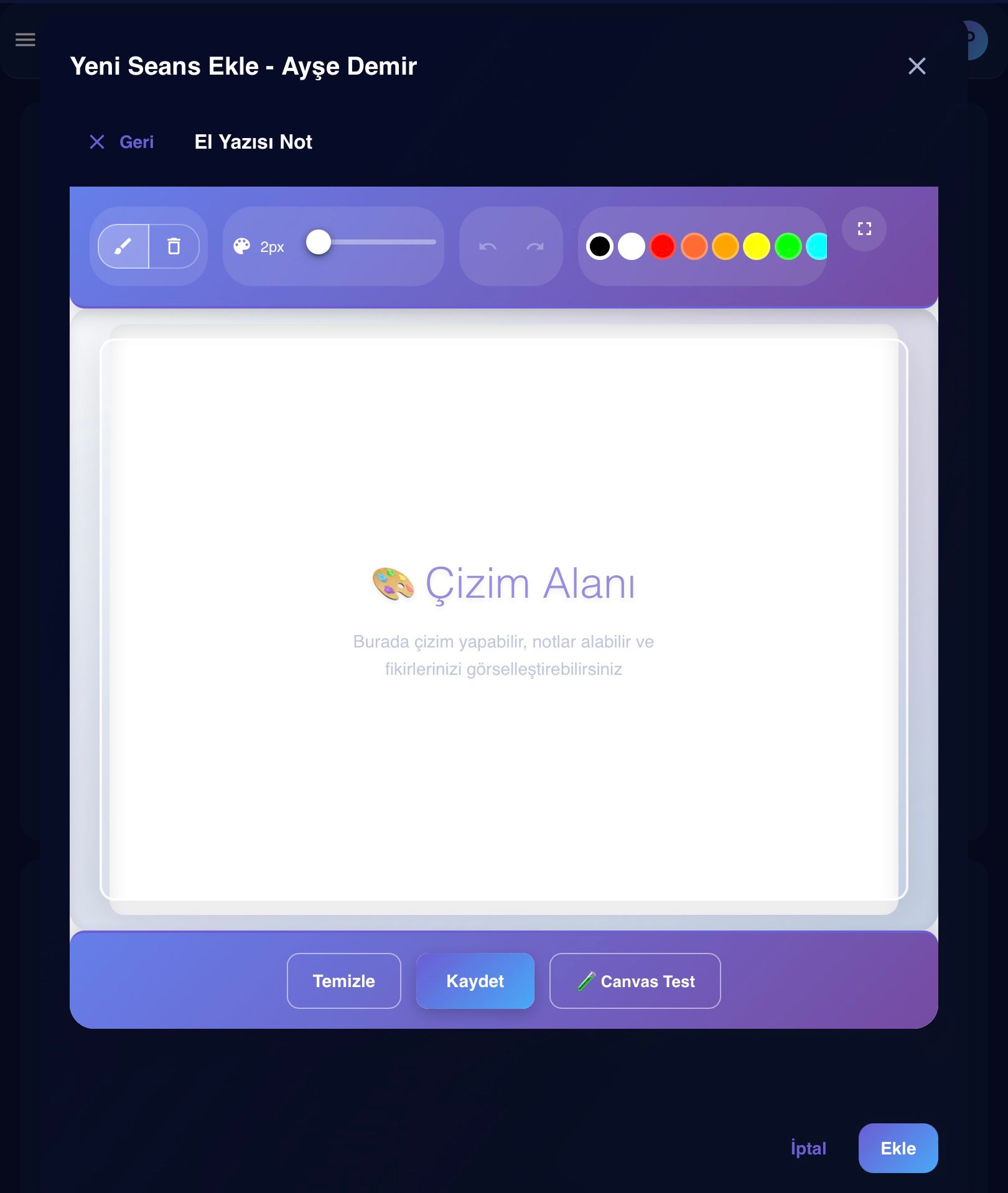 Terapinot’un en dikkat çeken özelliklerinden biri, gelişmiş not alma sistemidir. Sadece metin yazmakla kalmayıp, çizim araçları kullanarak danışanlarınızın çizimlerini dijital ortamda kaydedebilirsiniz. Farklı renkler ve kalınlıklarda kalemler kullanabilir, fotoğraf yükleyebilir. Tam ekran modu ile daha rahat çalışabilirsiniz.